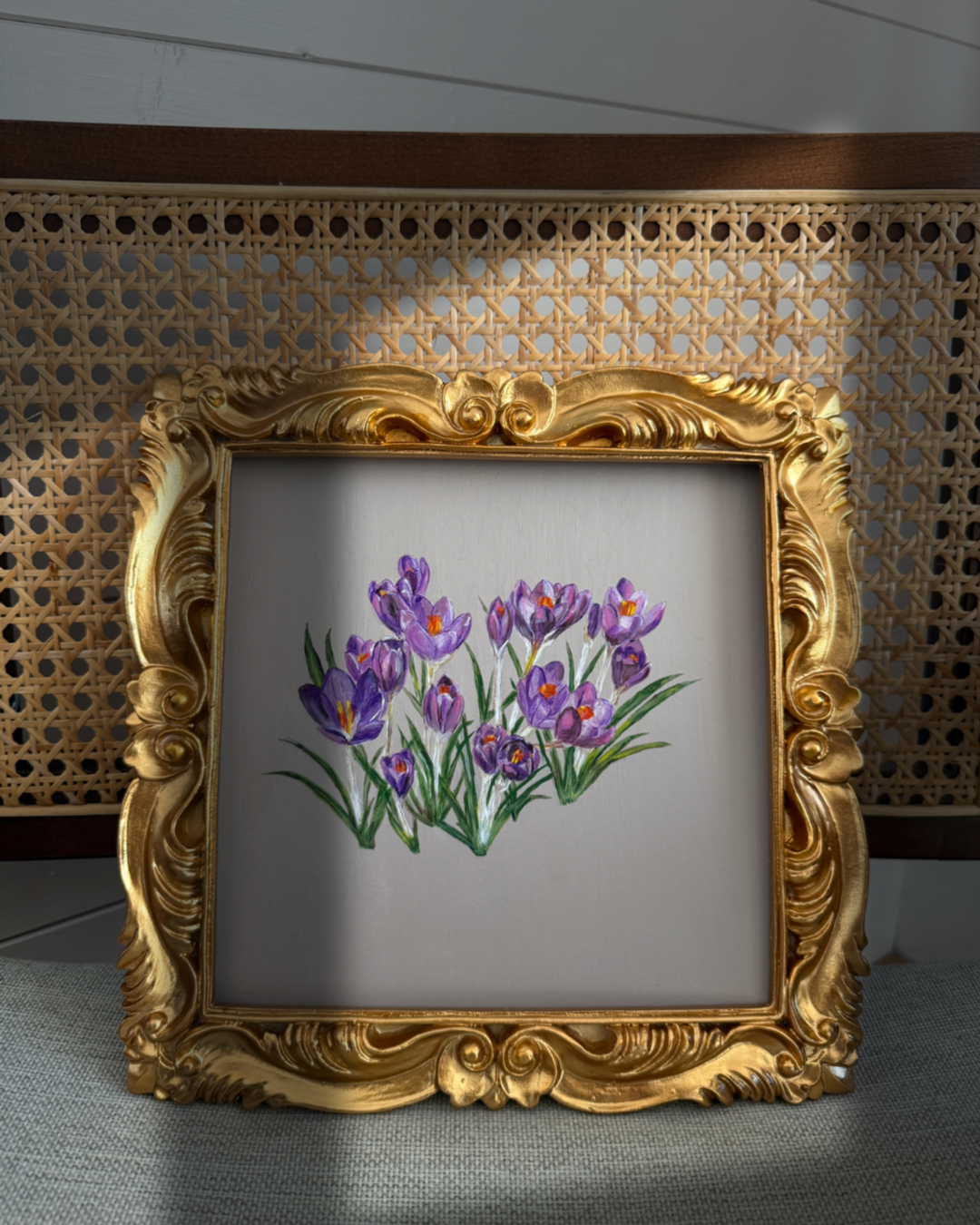 This is my sixth original painting of 2026, created as part of a personal challenge to complete one new artwork each week. This original work is an acrylic painting on high quality paper, sold in a gold retro photo frame and is perfect for pairing with “January Snowdrops” as part of a monthly floral collection. Frame included in the price.
