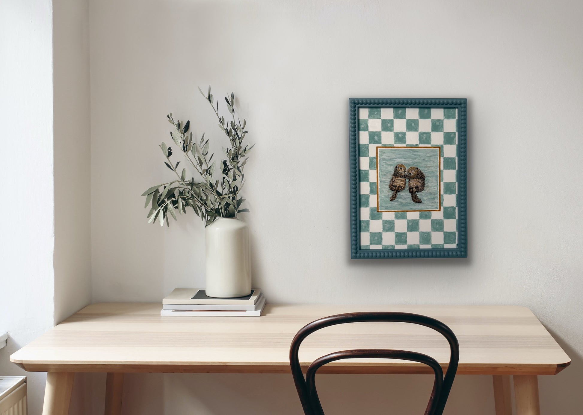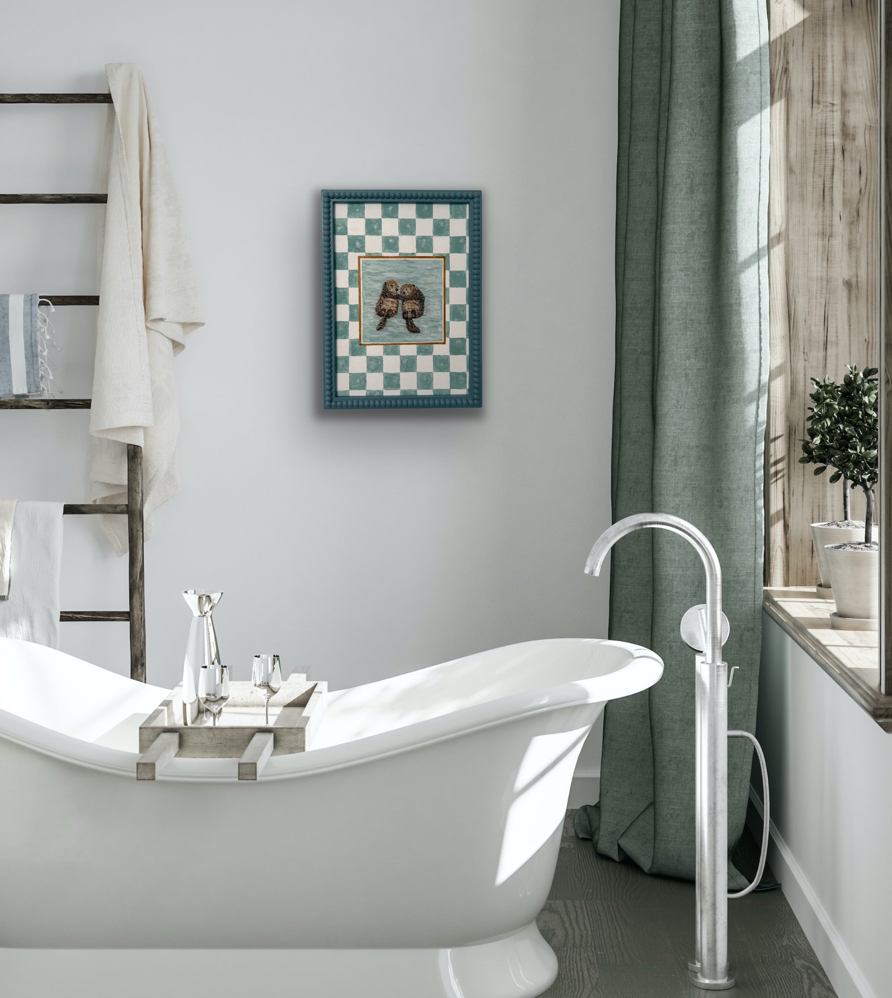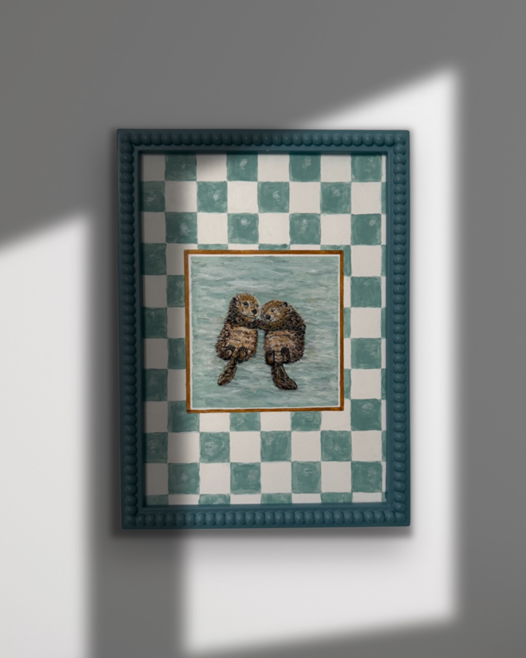 Celebrate the warmth of togetherness with In Good Company, a charming coupling of two cuddling otters floating peacefully in calm waters. Bordered by a hand-painted checkerboard in soft teal and cream tones, this print blends whimsy and coastal calm. Perfect for Valentine's Day or Anniversary gifts adding a gentle, affectionate touch to bathrooms, reading corners, or coastal-inspired interiors.
