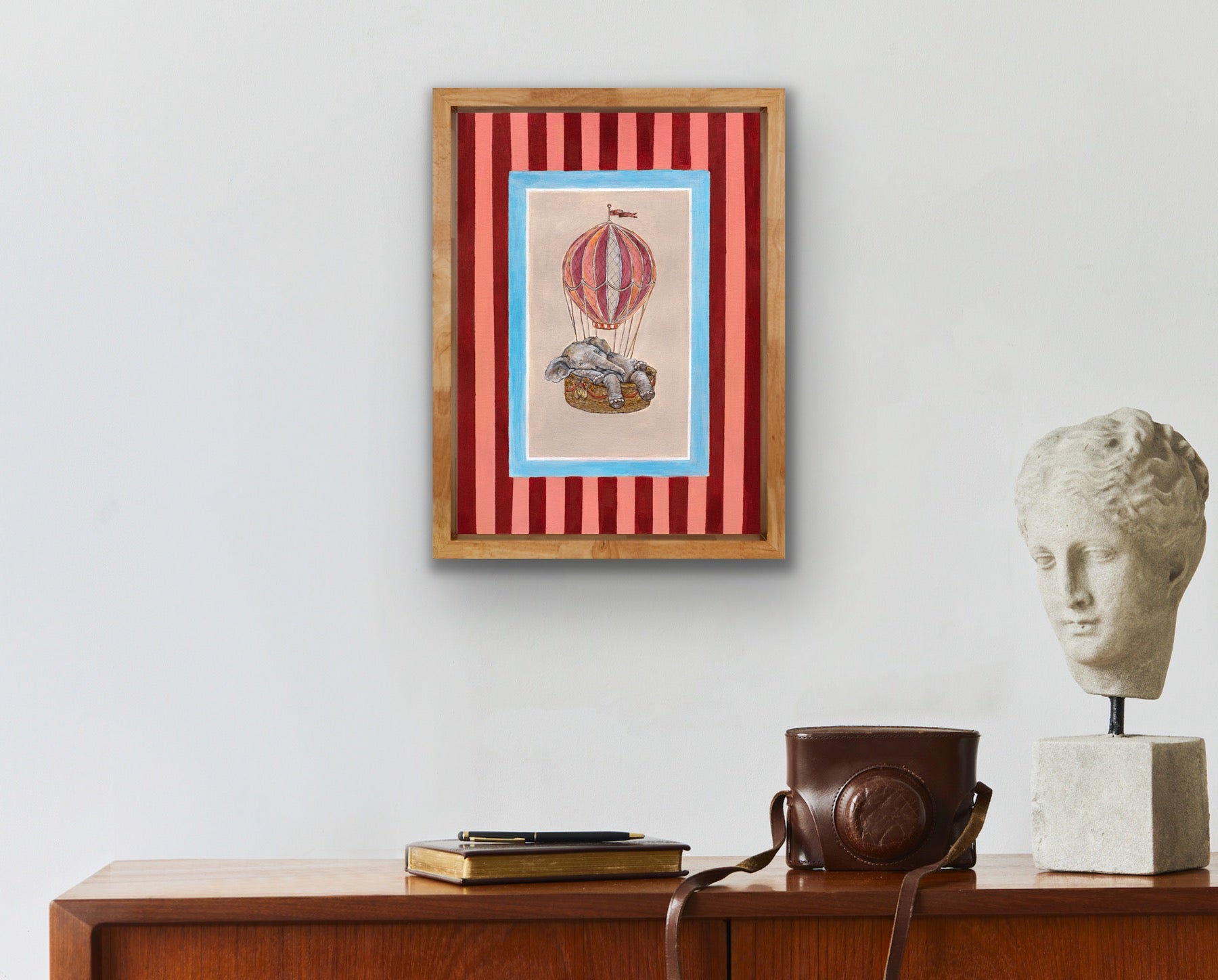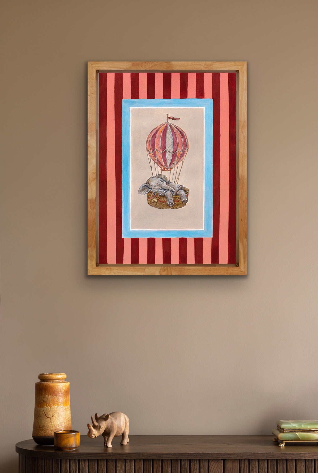 No Hurry is a gentle, storybook-inspired illustration celebrating taking life at a slower pace. A sleepy baby elephant drifts peacefully beneath a striped hot air balloon, creating a calm, playful scene full of quiet charm.